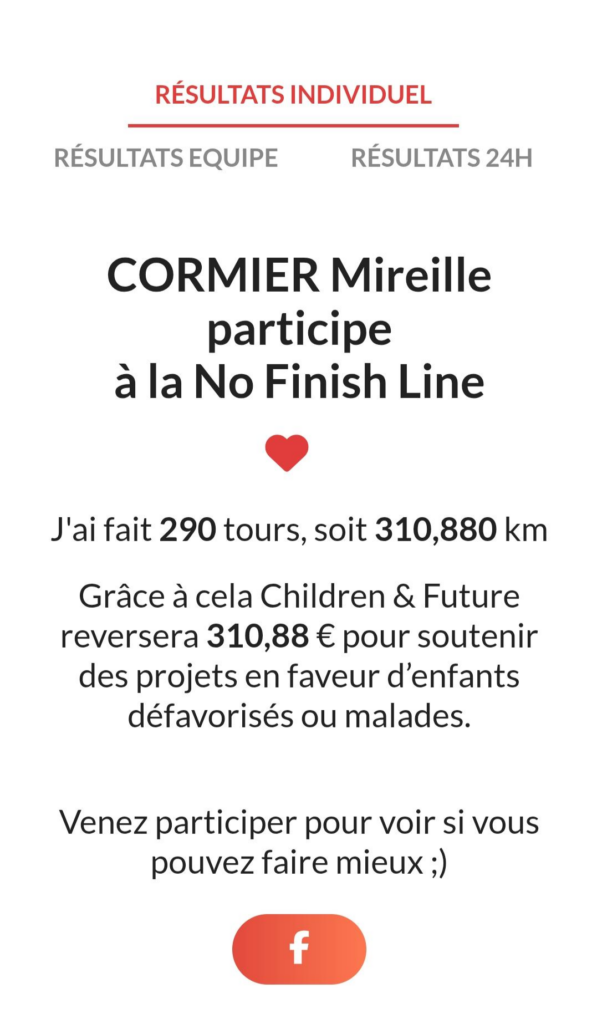 -Et ce n’est pas tout : Mireille (une Mireille peut en cacher une autre) dont nous avions évoqué le défi la semaine dernière, a terminé ses 8 jours de course sur la No Finish Line de Monaco avec… 310 km et 880 m au compteur. Oui, oui : 290 tours du parcours. Stratosphérique, bonne récup championne !
